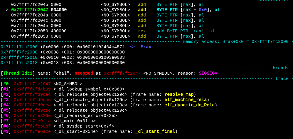 }Now we have a clear goal: corrupt some memory in the linker using bad relocations to hijack control flow before the linker exits.