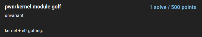 The challenge description links to this tmpout article which lays some foundations for LKM golfing (on v5.15), concluding with an 800 byte hello world module. It’s possible to reduce this much further, although I should note that additional checks have recently been added that make this challenge impossible on the latest version of Linux, so keep in mind that the solution and ELF processing code we will be analyzing (mostly under kernel/module/main.c) are specific to v6.3.